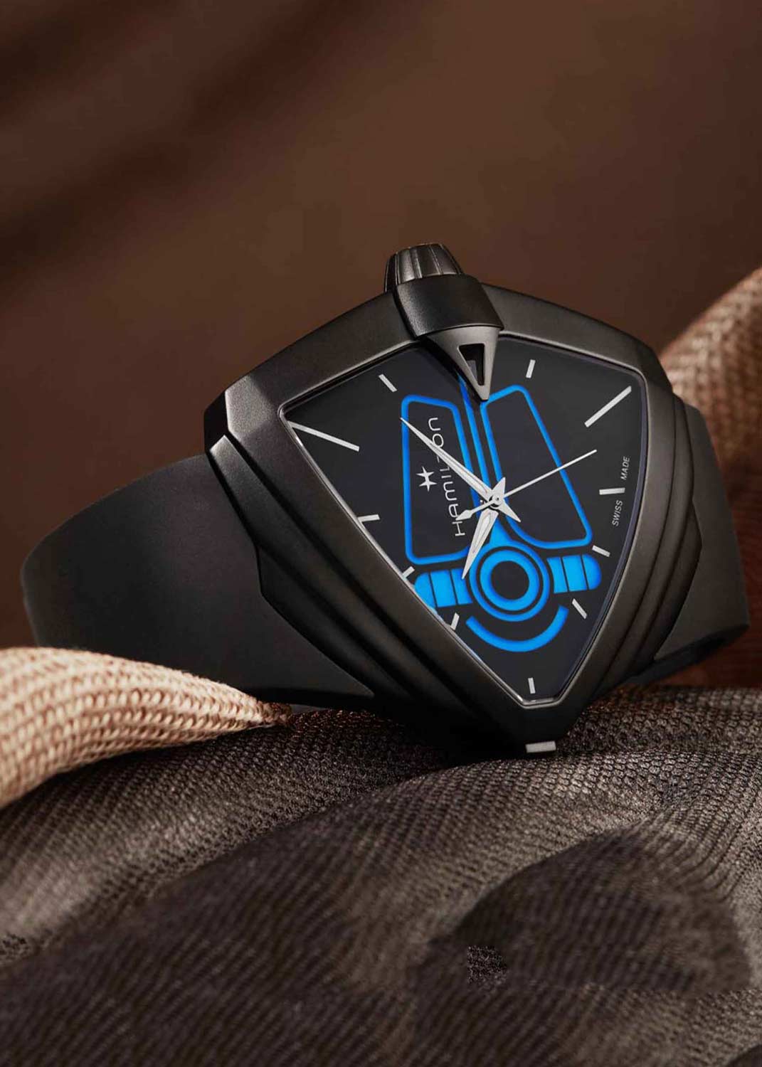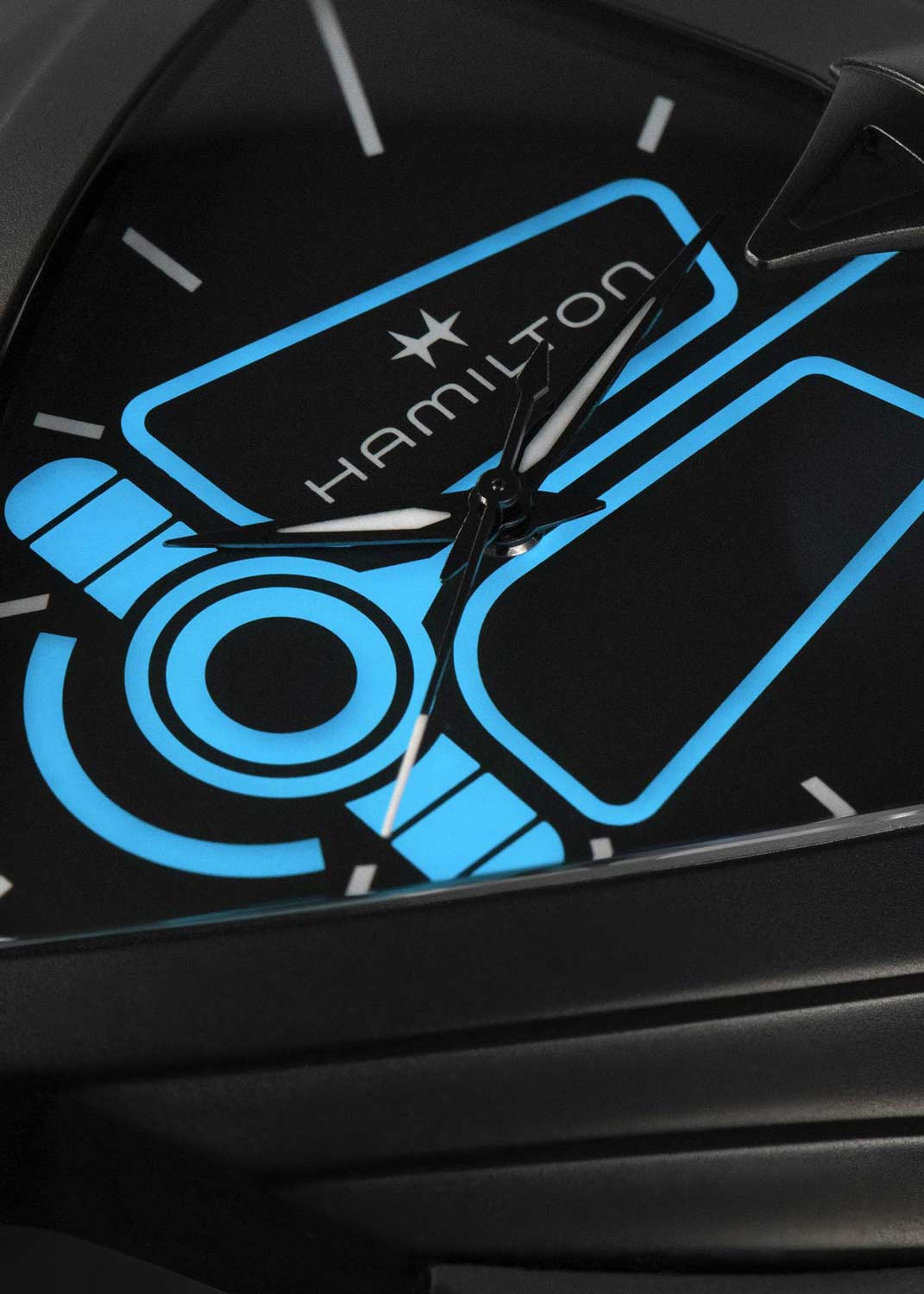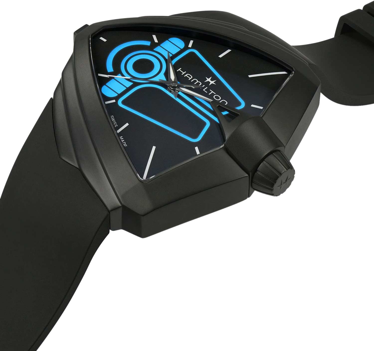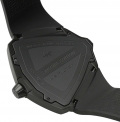 Мужские наручные часы. Треугольный стальной корпус. Циферблат с метками в виде штрихов. Клиновидные стрелки в стиле Dauphine с люминесцентным покрытием, которое светится в темноте после непродолжительной зарядки на свету. Рифленая заводная головка. Задняя крышка крепится на 4-х винтах. Каучуковый ремешок с классической застежкой.