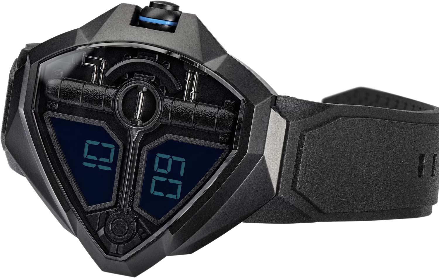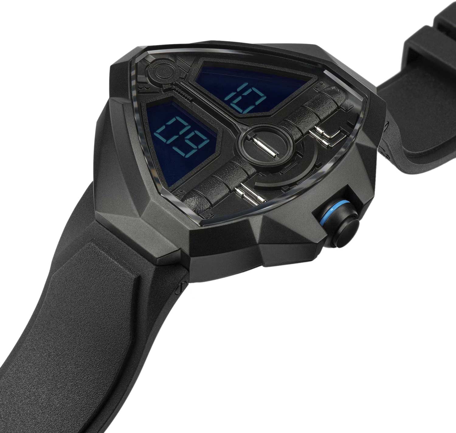 Мужские наручные часы. Треугольный стальной корпус. Циферблат оснащен дисплеем с двумя экранами: на верхнем отображаются часы, на нижнем — минуты.
