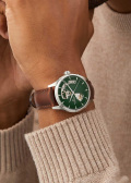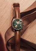 Рифленая заводная головка. Прозрачная задняя крышка. Кожаный ремешок с классической застежкой.
