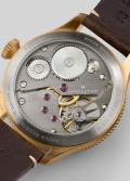 Круглый металлический корпус. Запас хода 50 часов. Циферблат с метками в виде арабских цифр. Секундная стрелка вынесена на отдельный циферблат. Рифленая заводная головка. Прозрачная задняя крышка. Кожаный ремешок с классической застежкой.