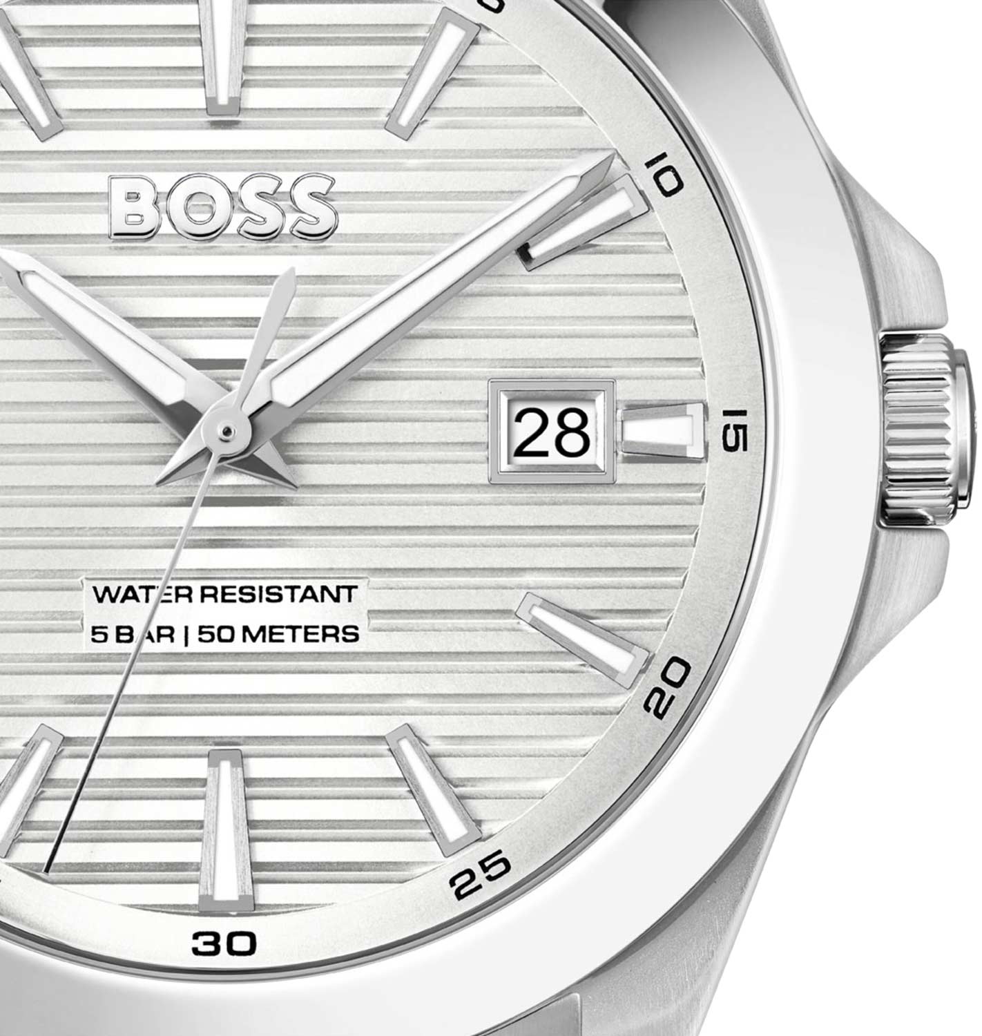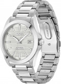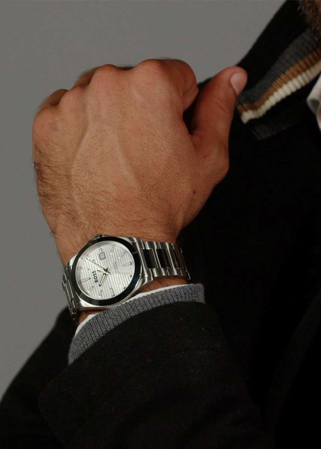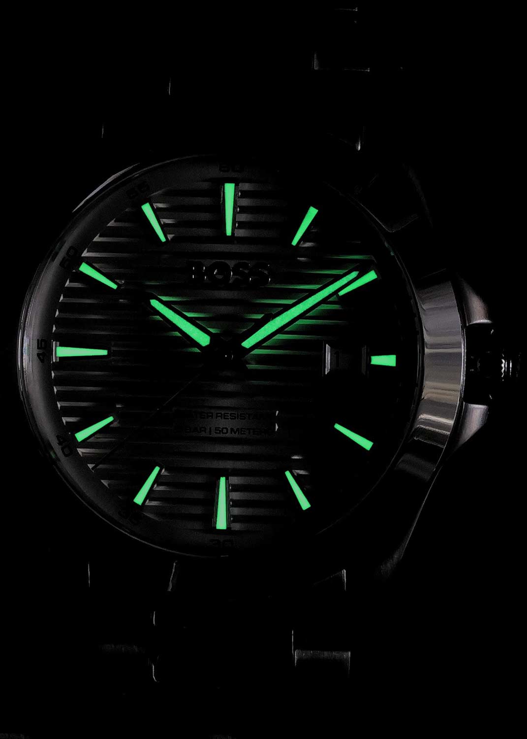 Метки и стрелки с люминесцентным покрытием, которое светится в темноте после непродолжительной зарядки на свету. Окошко даты находится в положении 3 часа. Рифленая заводная головка с защитой. Браслет с раскладывающейся застежкой.