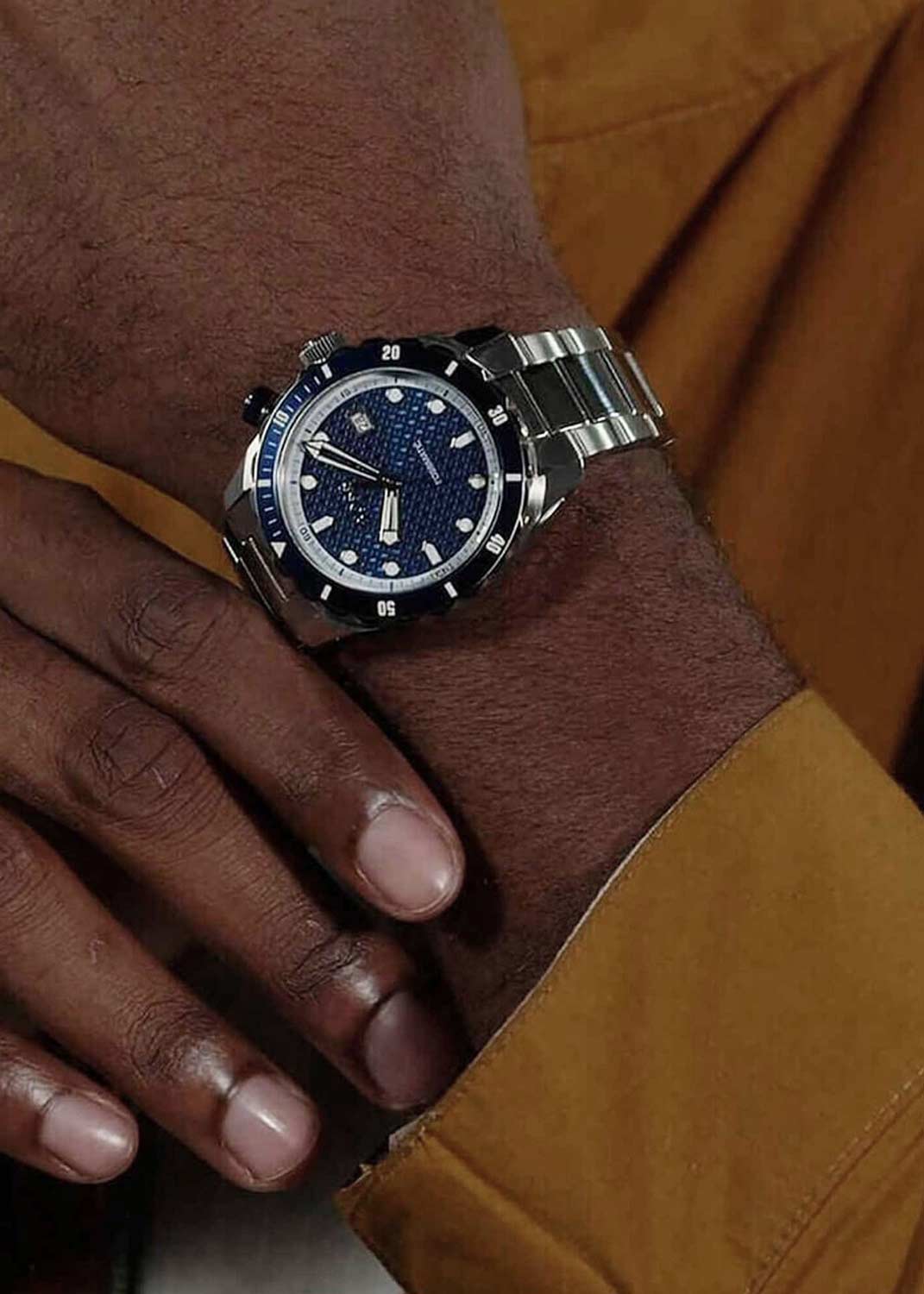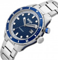 Окошко даты находится в положении 3 часа. Рифленая заводная головка. Завинчивающаяся прозрачная задняя крышка. Браслет с раскладывающейся застежкой.