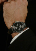 Прямоугольные стрелки в стиле Baton. Окошко даты находится между часовыми метками 4 и 5. Рифленая заводная головка. Кожаный ремешок с классической застежкой.