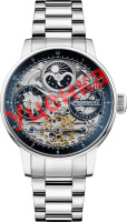 Скелетонизированные часы. В механизме 22 камня. Круглый стальной корпус. Второй часовой пояс на отдельном циферблате с часовой и минутной стрелками. Индикатор день/ночь. Рифленая заводная головка.