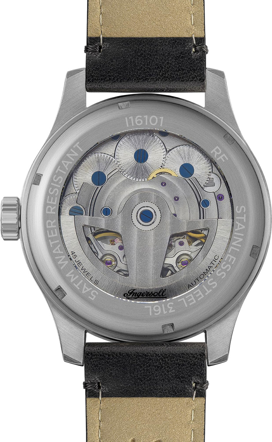 Завинчивающаяся прозрачная задняя крышка. Часовой механизм декорирован «женевскими волнами» (Cotes de Geneve). Кожаный ремешок с классической застежкой.