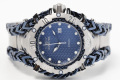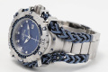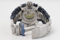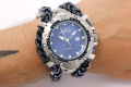 Массивный стальной вращающийся безель с минутной шкалой. Корпус, безель и браслет обрамлены объемными декоративными цепями V-образного плетения, придающими часам потрясающий уникальный внешний вид. Циферблат украшен объемным декоративным узором. Мечевидные стрелки в стиле Sword. Метки в виде точек. Метки и стрелки с белым люминесцентным