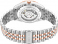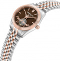 Сквозь прозрачное окошко на циферблате можно наблюдать за работой механизма часов. Рифленая заводная головка. Прозрачная задняя крышка. Стальной браслет с раскладывающейся застежкой.