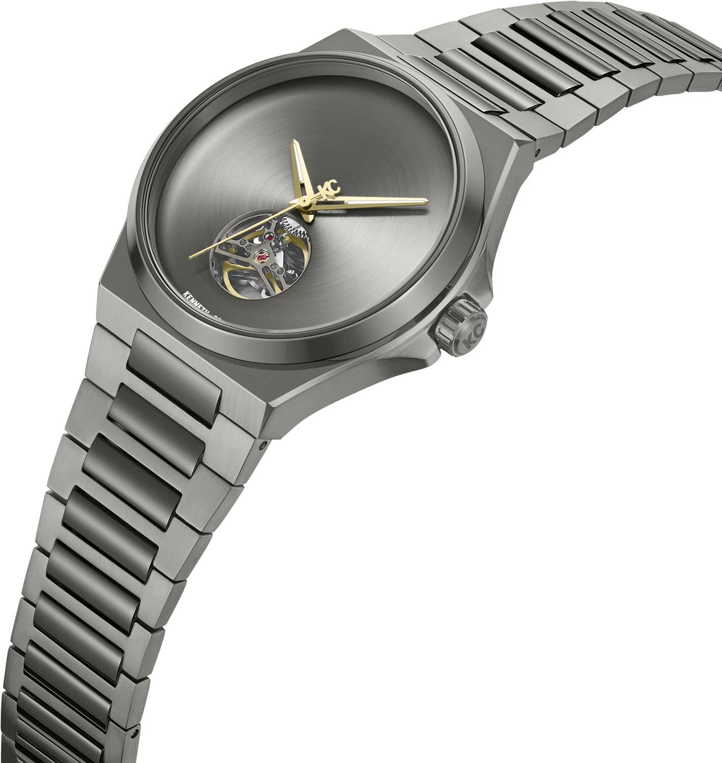 Рифленая заводная головка с защитой. Завинчивающаяся прозрачная задняя крышка. Браслет с раскладывающейся застежкой.