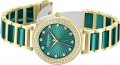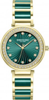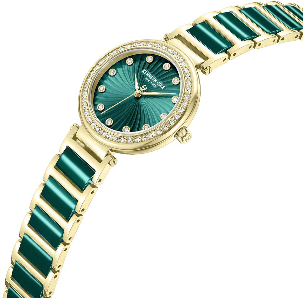 инкрустирован кристаллами. Гильошированный циферблат выполнен по технологии Sunray (солнечные лучи). Метки в виде точек с кристаллами. Рифленая заводная головка. Браслет с керамическими