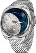 Левая часть циферблата — детально проработанная поверхность Луны с имитацией лунного грунта. Для передачи текстуры использован тончайший лист серебряной фольги, что придает рельефу особую выразительность.