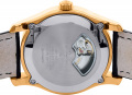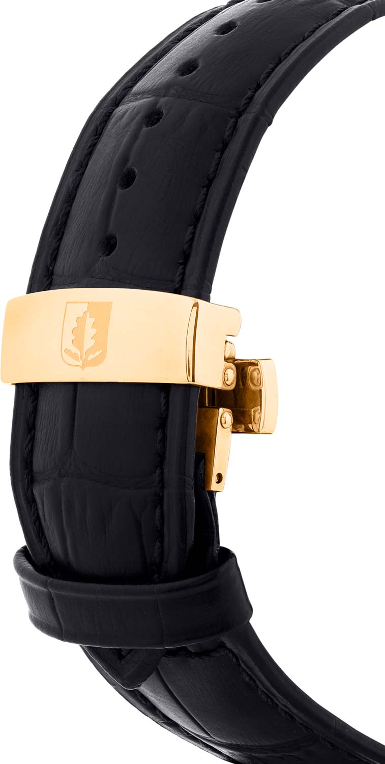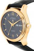 Метки в виде штрихов и римских цифр XII и VI. Клиновидные стрелки в стиле Dauphine. Окошко даты и дня недели находится в положении 3 часа. Работу механизма можно наблюдать через прозрачное окошко на задней крышке часов, которая крепится на 4 винтах. Кожаный ремешок с застежкой-бабочкой.