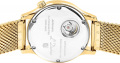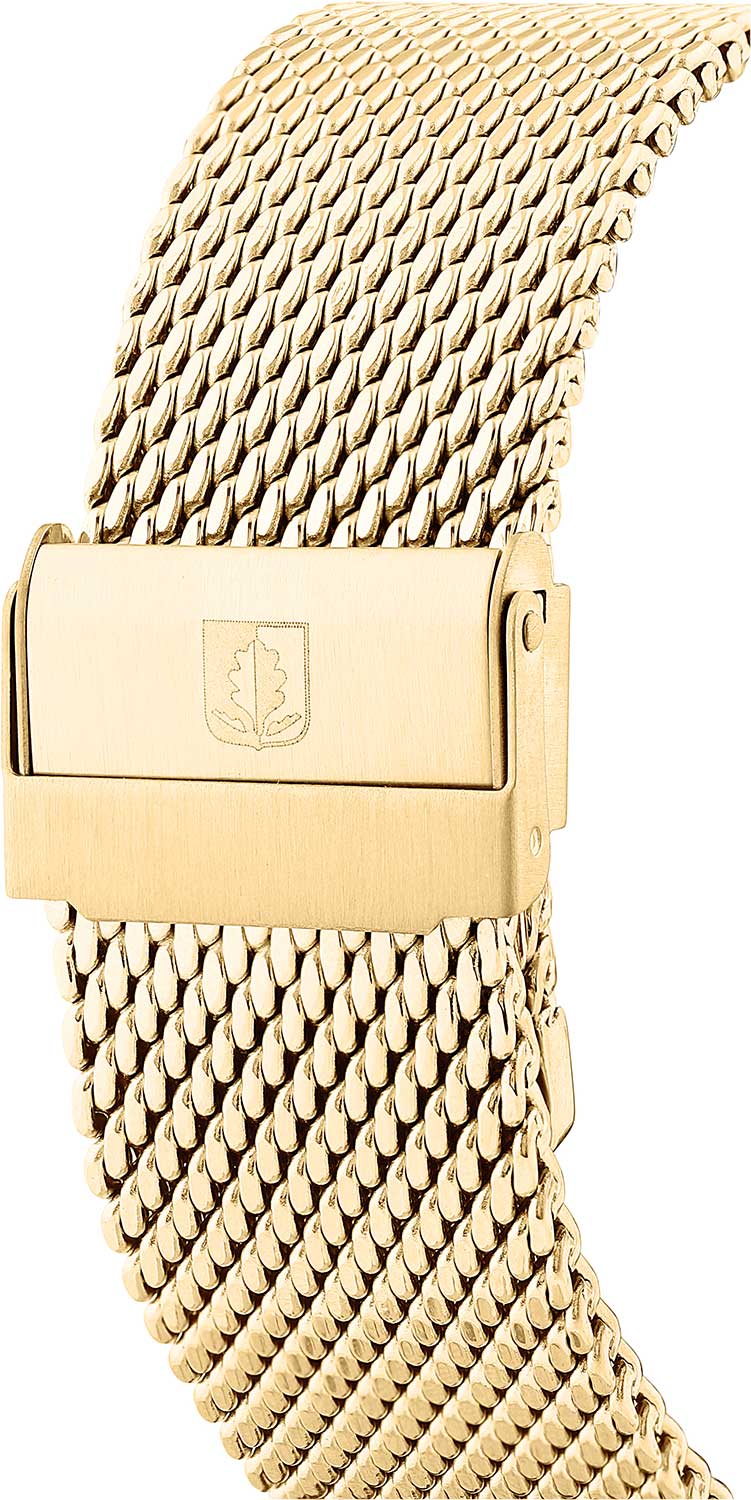 покрытием, которое светится в темноте после непродолжительной зарядки на свету. Метки в виде точек, 12-ти часовая метка в виде арабской цифры. Окошки даты и дня недели находятся в положении 4 часа. Необычно расположена рифленая заводная головка в положении 4 часов, что удобно и уменьшает соприкосновения с рукой. Работу механизма можно наблюдать через прозрачное окошко на задней крышке часов. Удобный и надежный стальной браслет миланского плетения с регулируемой застежкой. Застежка и заводная головка часов декорированы логотипом марки - «дубовый лист», который олицетворяет мудрость и долговечность.