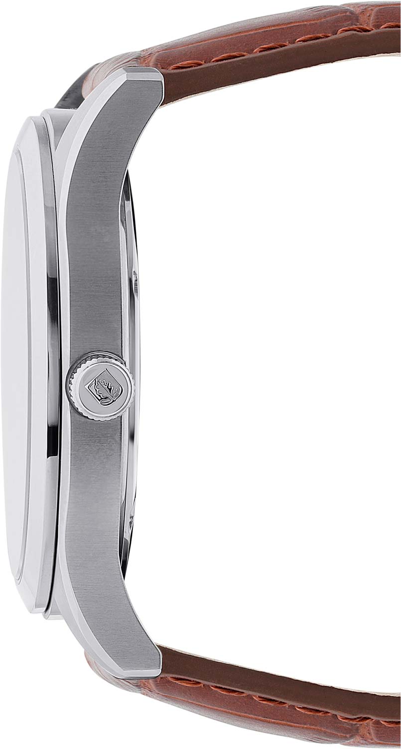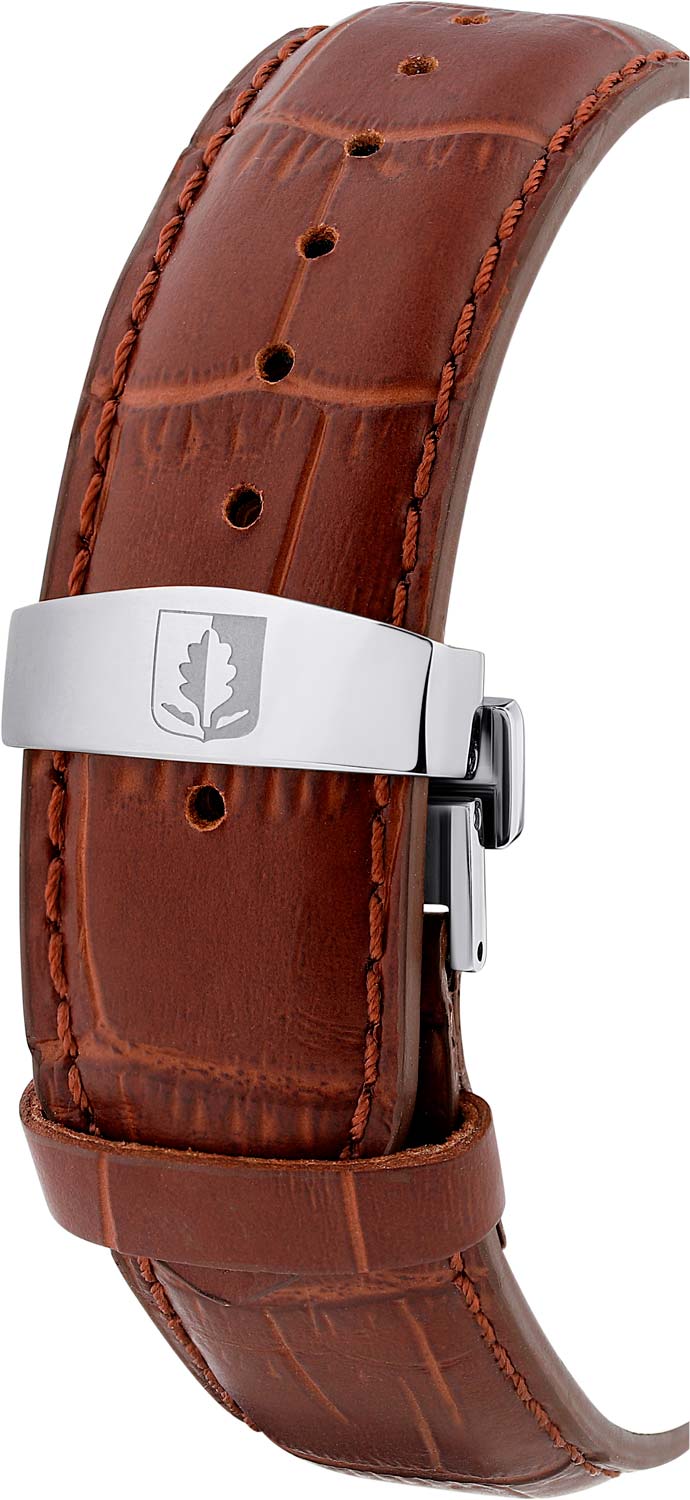 Рифленая заводная головка. Завинчивающаяся задняя крышка. Ремешок с застежкой-бабочкой. Застежка и заводная головка часов декорированы логотипом марки - ''дубовый лист'', который олицетворяет мудрость и долговечность.