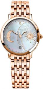 Day & Night. Круглый стальной корпус c полированной поверхностью. Циферблат украшен узором из волнистых линий. Узкие листовидные стрелки в стиле Feuille. Метки в виде точек, 12-ти часовая метка в виде логотипа. Окошко даты находится в положении 6 часов. Граненая заводная головка. Удобный и надежный стальной браслет.