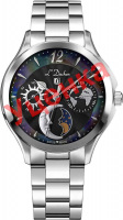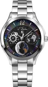 Женские часы с круглым стальным корпусом Celeste. Гильошированный циферблат с перламутровой вставкой украшен фирменным логотипом L'Duchen в виде дубового листа – символа мудрости и долговечности. Метки в виде штрихов и арабской цифры 12. Число и день недели вынесены на отдельные циферблаты. Указатель фаз Луны находится в положении 6 часов. Рифленая заводная головка с защитой. Браслет с раскладывающейся застежкой.