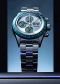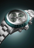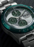 В механизме 25 камней, частота 28800 полуколебаний в час. Круглый стальной корпус. Безель с зеленым IP покрытием. Серебристый циферблат с дополнительными циферблатами зеленого цвета. Метки в виде штрихов.