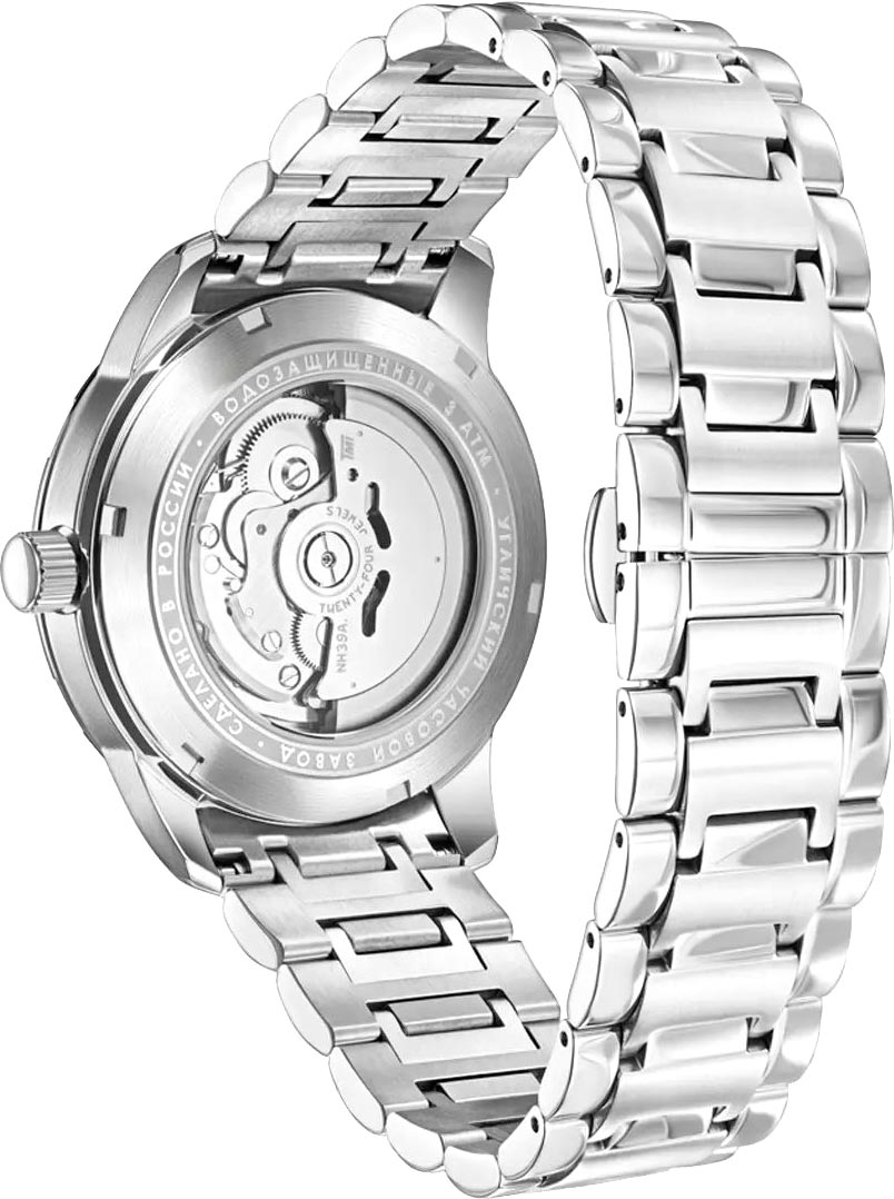Завинчивающаяся прозрачная задняя крышка. Стальной браслет с раскладывающейся застежкой.