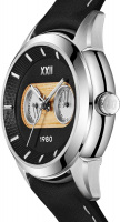 Метки в виде штрихов. Дата и день недели вынесены на отдельные малые циферблаты. Рифленая заводная головка с гравировкой ''80''.