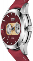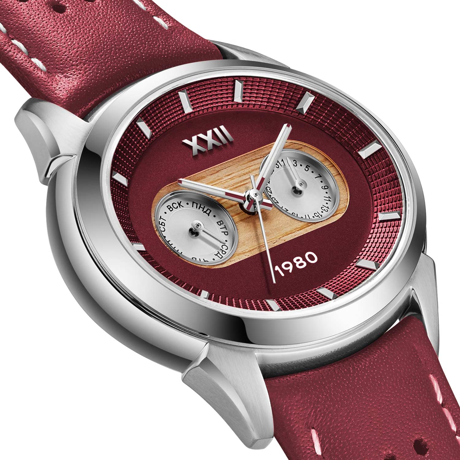 Метки в виде штрихов. Дата и день недели вынесены на отдельные малые циферблаты. Рифленая заводная головка с гравировкой ''80''.