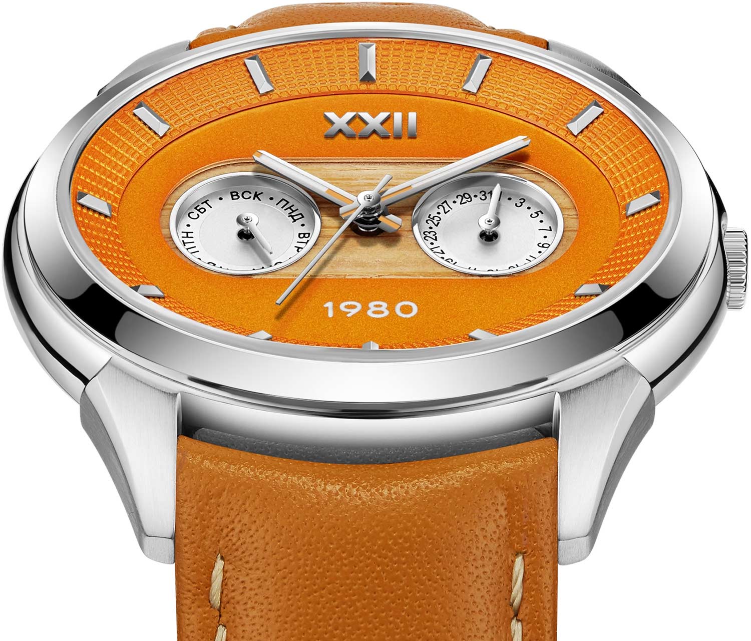 Метки в виде штрихов. Дата и день недели вынесены на отдельные малые циферблаты. Рифленая заводная головка с гравировкой ''80''.