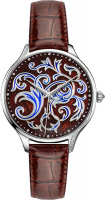 механизм Ronda (Швейцария). Самая необычная часть этих часов - циферблат. Циферблатная пластина изготовлена из серебра 925 пробы и декорирована с помощью перегородчатой эмали. Для получения рисунка серебряные перегородки напаиваются на поверхность циферблата по намеченному рисунку, образовывая ячейки, который заполняются эмалевым порошком. Позже циферблат погружается в печь, превращая порошок в стекло. Техника позволяет создать уникальный рисунок, который невозможно воспроизвести точь-в-точь, что делает каждые часы единственными в своем роде. Для того, чтобы передать всю чистоту красок, в часах установлено сапфировое