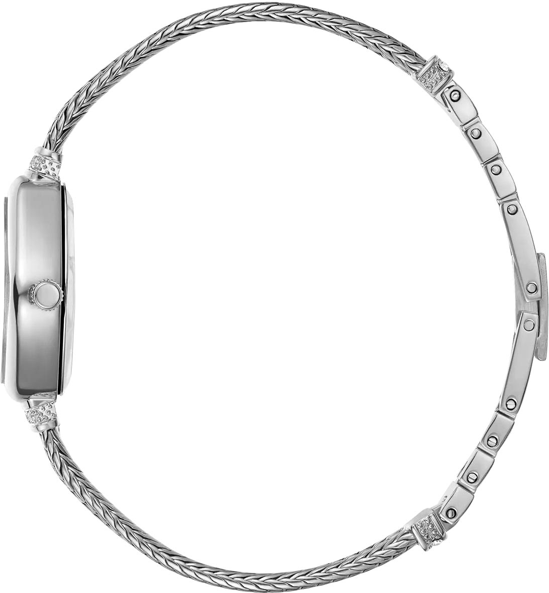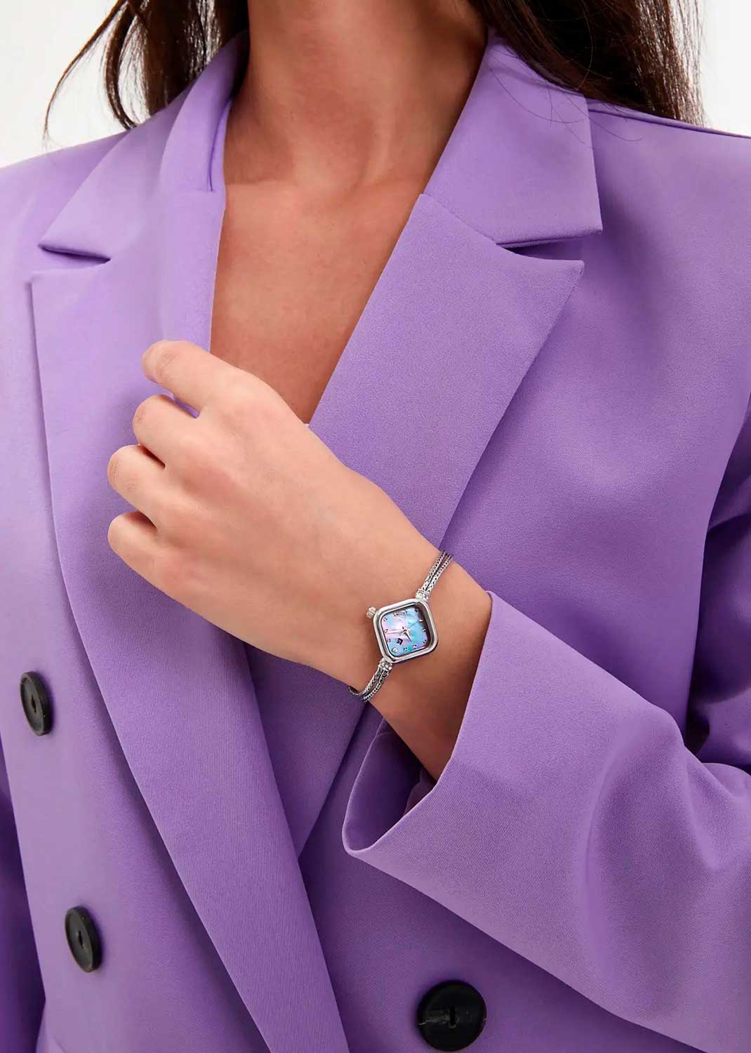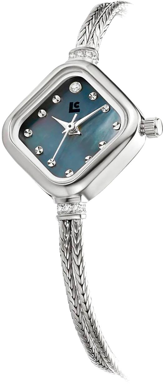Накладные метки в виде точек с алмазной гранью, метка на 12 часов украшена фианитом. Рифленая заводная головка. Стальной двойной канатообразный браслет с ювелирной застежкой декорирован фианитами.