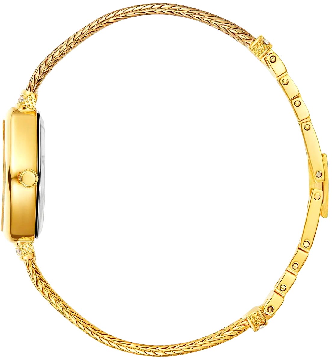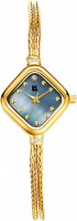 Накладные метки в виде точек с алмазной гранью, метка на 12 часов украшена фианитом. Рифленая заводная головка. Стальной двойной канатообразный браслет с ювелирной застежкой декорирован фианитами.