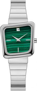 Женские часы с необычным стальным корпусом. Циферблат выполнен из малахита и защищен прочным сапфировым стеклом. Метки в виде штрихов. Задняя крышка крепится на 4-х винтах. Браслет с раскладывающейся застежкой.
