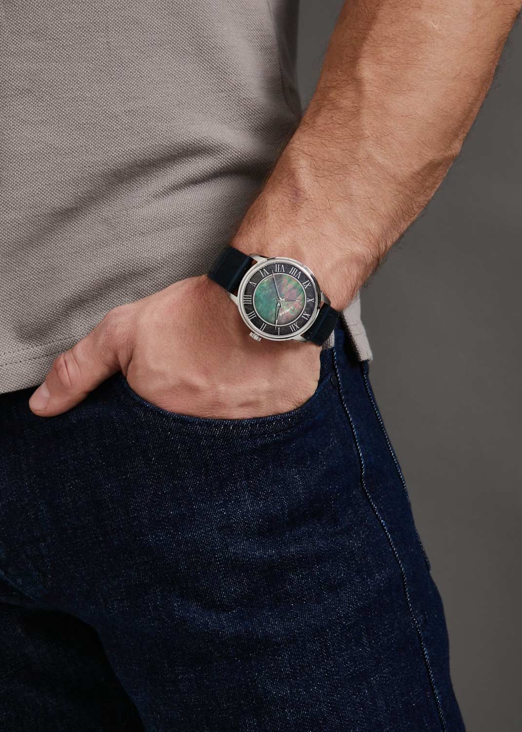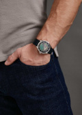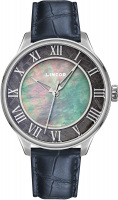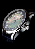 Круглый стальной корпус. Перламутровый циферблат с фактурным кольцом из фрагмента настоящего метеорита ''Муонионалуста'' защищен прочным сапфировым стеклом. Метки в виде римских цифр.