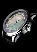 Круглый стальной корпус. Перламутровый циферблат с фактурным кольцом из фрагмента настоящего метеорита ''Муонионалуста'' защищен прочным сапфировым стеклом. Метки в виде римских цифр.