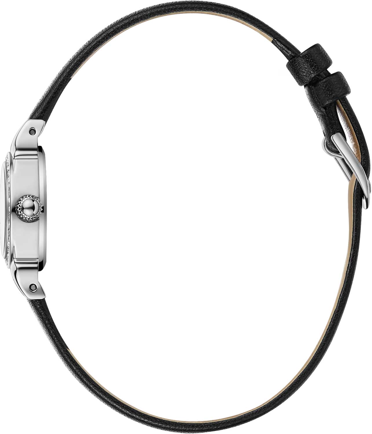 Метки в виде арабских цифр и штрихов. Рифленая заводная головка. Удобный кожаный ремешок с классической застежкой.