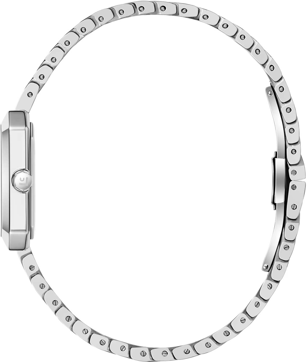 Шестигранная заводная головка. Стальной браслет в виде звеньев ''в елочку'' с раскладывающейся застежкой.