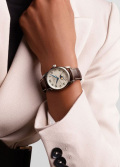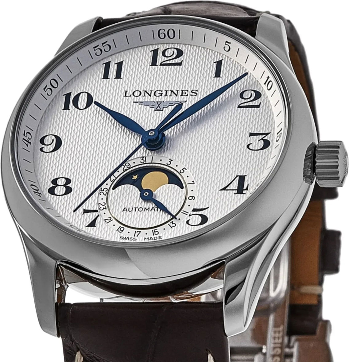 Круглый стальной корпус. Гильошированный циферблат защищен прочным сапфировым стеклом. Метки в виде арабских цифр. Индикатор даты и фаз Луны находится в положении 6 часов.