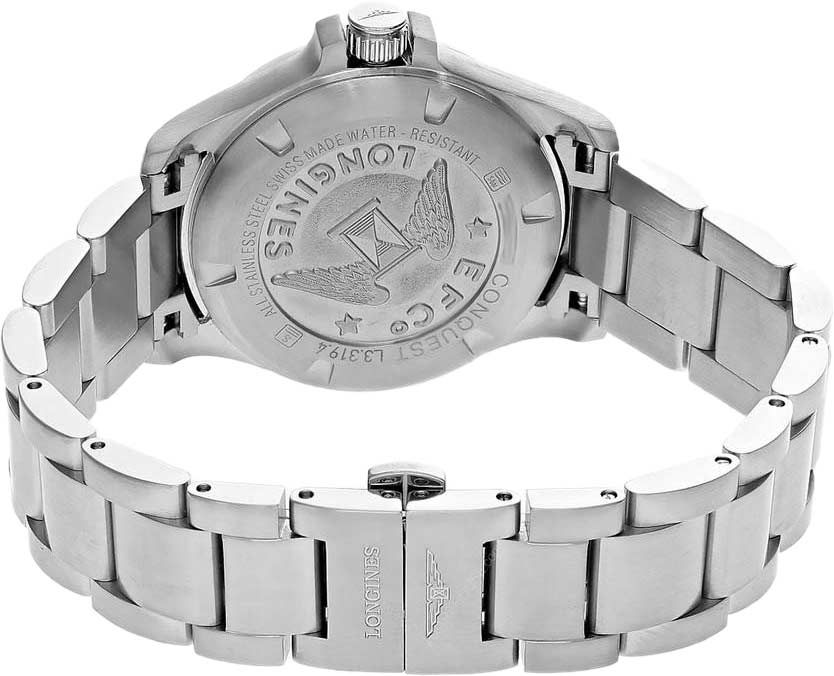 Окошко даты находится в положении 3 часа. Рифленая заводная головка с защитой. Завинчивающаяся задняя крышка украшена объемным логотипом компании Longines. Браслет с раскладывающейся застежкой. Внешний вид упаковки может отличаться от представленной на фото. Уточняйте при заказе.