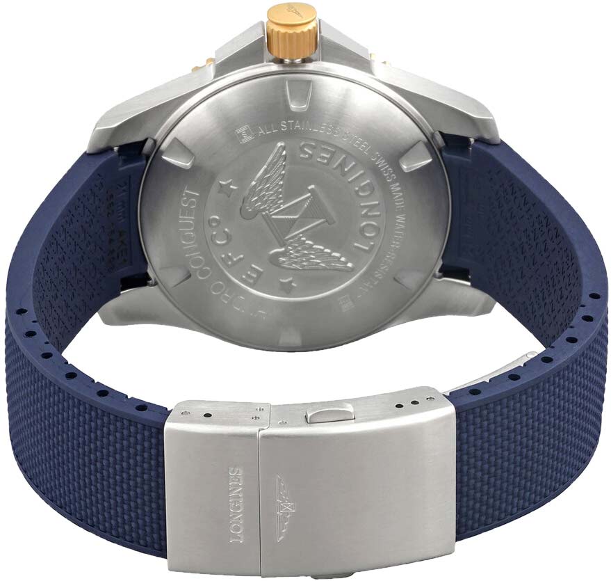 Завинчивающаяся задняя крышка украшена объемным логотипом компании Longines. Ремешок с двойной раскладывающейся застежкой. Застежка с системой блокировки. Внешний вид упаковки может отличаться от представленной на фото. Уточняйте при заказе.