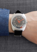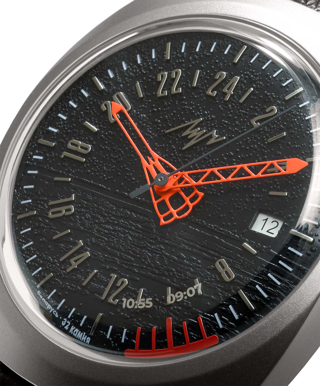 Текстурный циферблат вдохновлен поверхностью Земли с высоты первого полета – около 300 километров. Накладные метки в виде штрихов и арабских цифр. Стрелки выполнены в виде ракеты «Восток-1». На прочное сапфировое стекло нанесено время полета космонавта «10:55 09:07». Окошко даты находится в положении 3 часа.