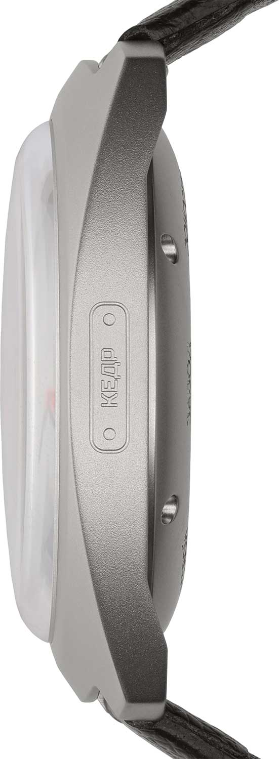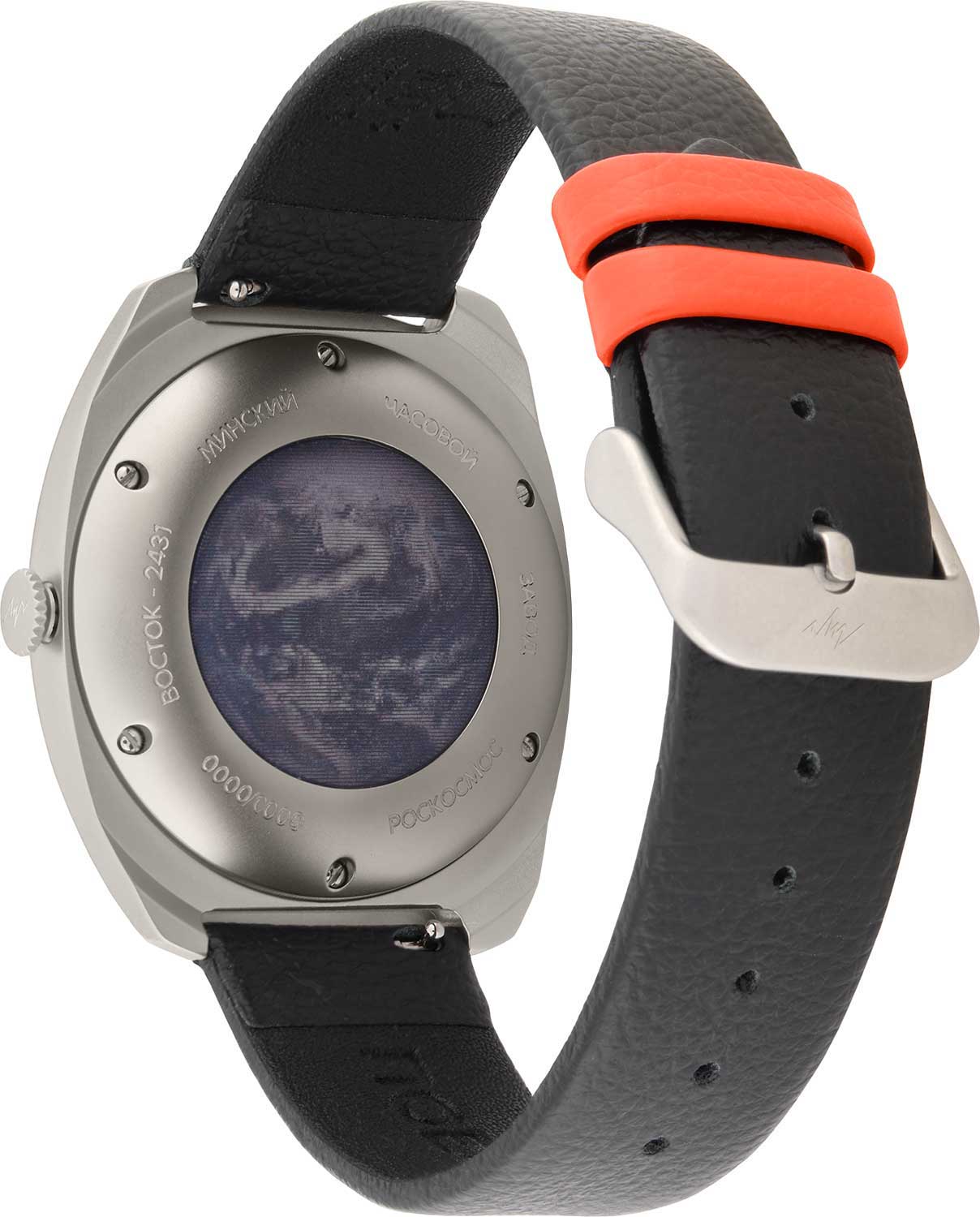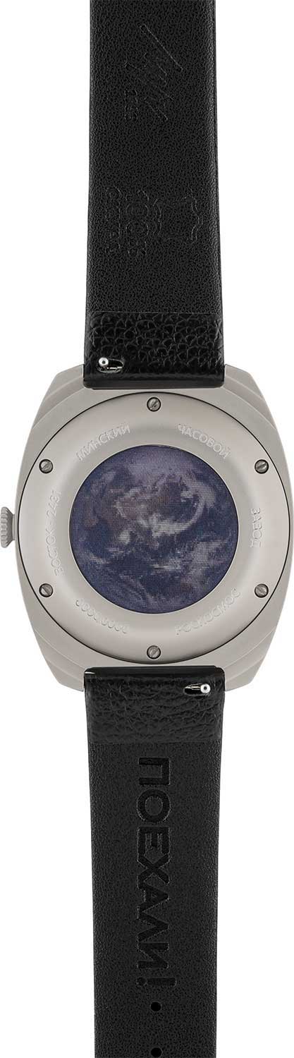 Задняя крышка с пластиковой вставкой, которая украшена изображением Земли, нанесенным методом лентикулярной печати. Ремешок с классической застежкой и системой быстрой замены украшен знаменитой фразой Юрия Гагарина – «Поехали!». В комплекте сменный кожаный ремешок.