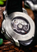 Циферблат дополнен объемной, детально проработанной змеей, периодически высовывающей язык. На вращающихся дисках — указатели часов и минут. Метки в виде арабских цифр и отдельные элементы на циферблате с люминесцентным покрытием, которое светится в темноте после непродолжительной зарядки на свету.
