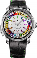 Циферблат представляет собой колесо рулетки с соответствующей атрибутикой. Метки в виде штрихов с кристаллами. Кнопка на левой стороне корпуса с функцией press-and-stop. Стрелки с люминесцентным покрытием, которое светится в темноте после непродолжительной зарядки на свету.