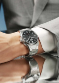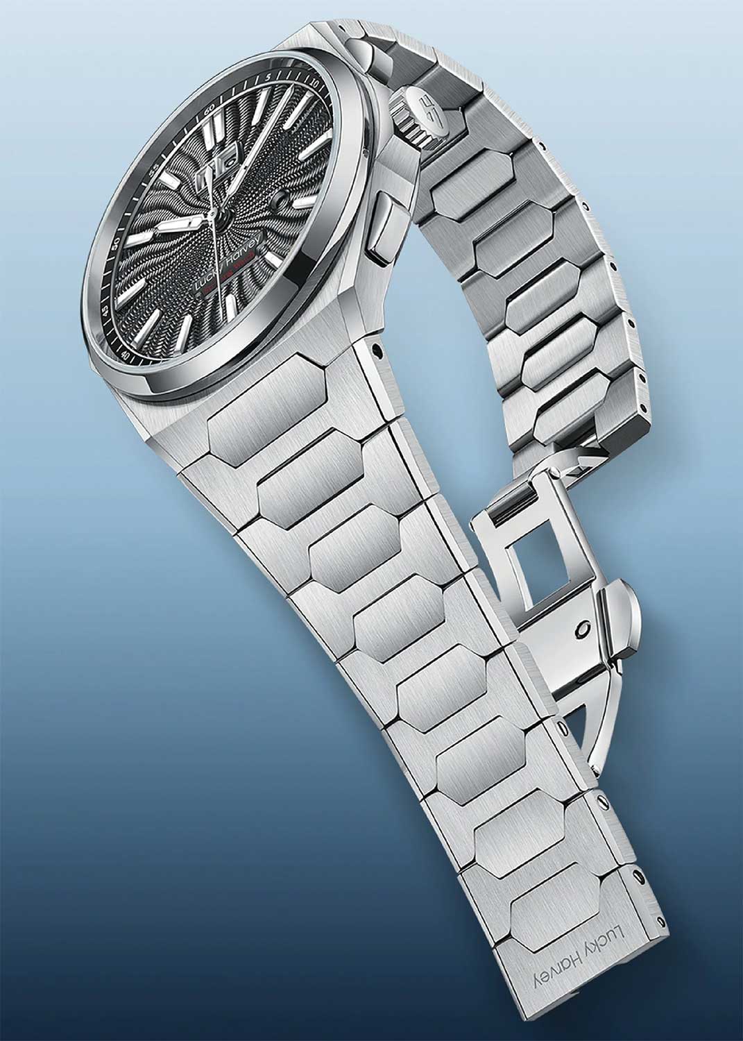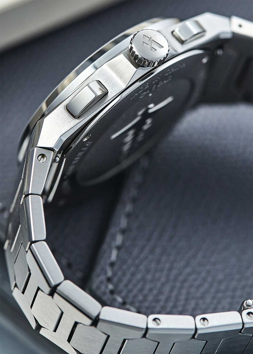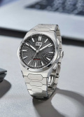 Рифленая заводная головка украшена фирменным логотипом. Задняя крышка с выгравированным изображением звуковой волны крепится на 4-х винтах. Браслет с раскладывающейся застежкой и системой быстрой замены.