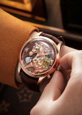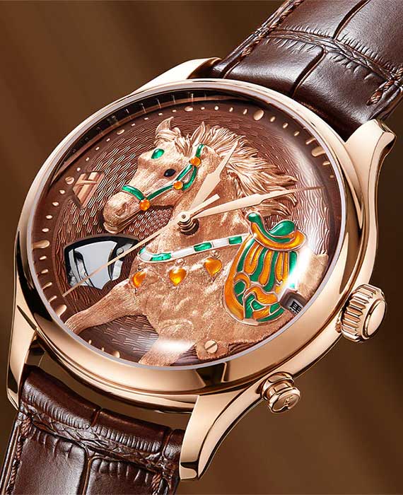 Циферблат дополнен объемной, детально проработанной лошадью, которая при активации совершает движения. Метки в виде точек.