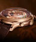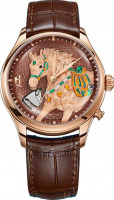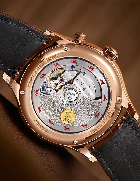 В механизме 30 камней, частота 21600 полуколебаний в час. Запас хода 40 часов. Ротор украшен изображениями лошадей. Функция ежечасного боя. Круглый корпус из титана 5-го класса.