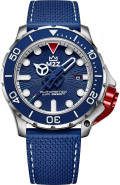 Diver 200. Мужские часы с моноблоковым корпусом. В механизме 24 камня, частота 21600 полуколебаний в час. Запас хода 41 час. Циферблат с метками в виде штрихов и точек. Окошко даты находится в положении 3 часа. Безель с силиконовой вставкой вращается в одном направлении - против часовой стрелки. Завинчивающаяся заводная головка с защитой и двойным уплотнительным кольцом находится в положении 4 часа. Защитный колпачок, закрывающий заводную головку. Задняя часть корпуса украшена изображением акулы. Ремешок с классической застежкой и системой быстрой замены. Упаковка в виде кислородного баллона.