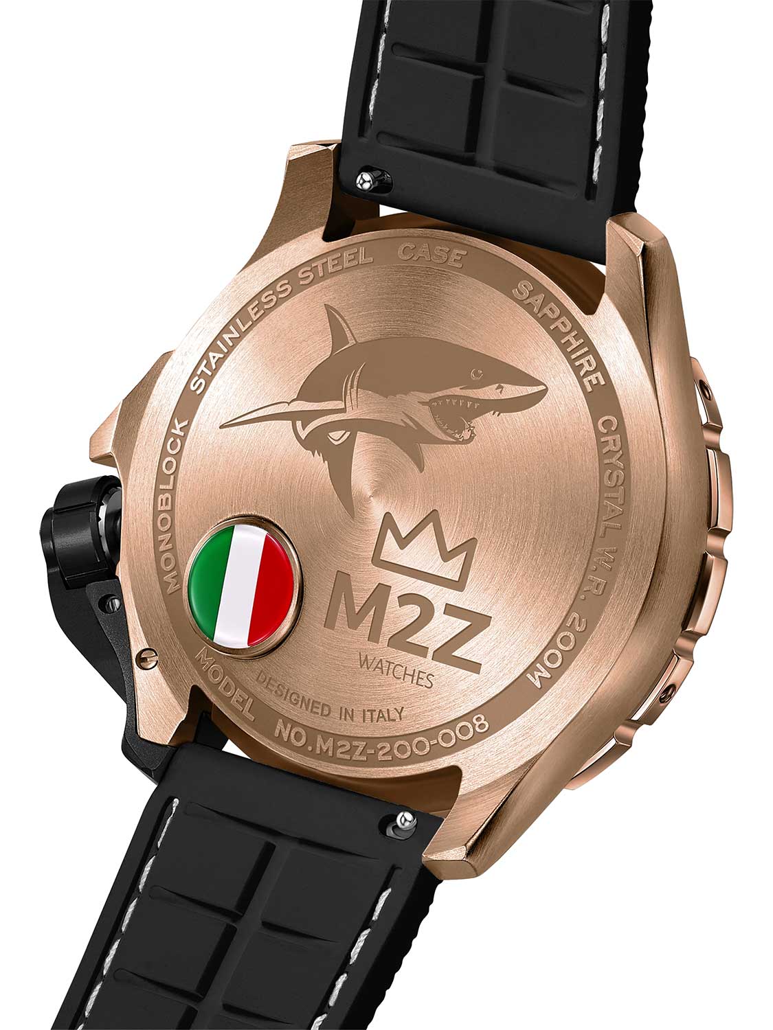 с силиконовой вставкой вращается в одном направлении - против часовой стрелки. Завинчивающаяся заводная головка с защитой и двойным уплотнительным кольцом находится в положении 4 часа. Защитный колпачок, закрывающий заводную головку. Задняя часть корпуса украшена изображением акулы. Ремешок с классической застежкой и системой быстрой замены.
