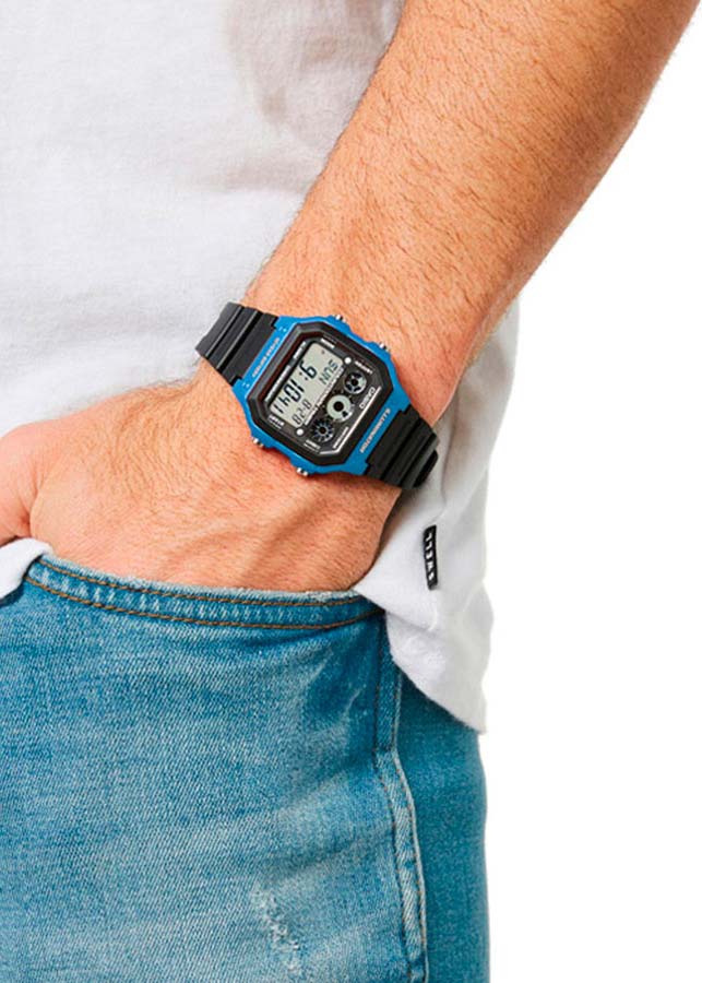 - мужские, японские, кварцевые, 100WR, стекло: пластиковое выпуклое, 45x48,2мм, толщина 13,8мм, вес 40г, AE-1000