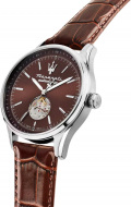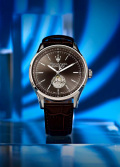 Сквозь прозрачное окошко на циферблате можно наблюдать за работой механизма часов. Завинчивающаяся рифленая заводная головка. Завинчивающаяся прозрачная задняя крышка. Кожаный ремешок с классической застежкой.