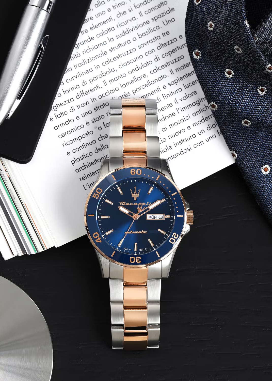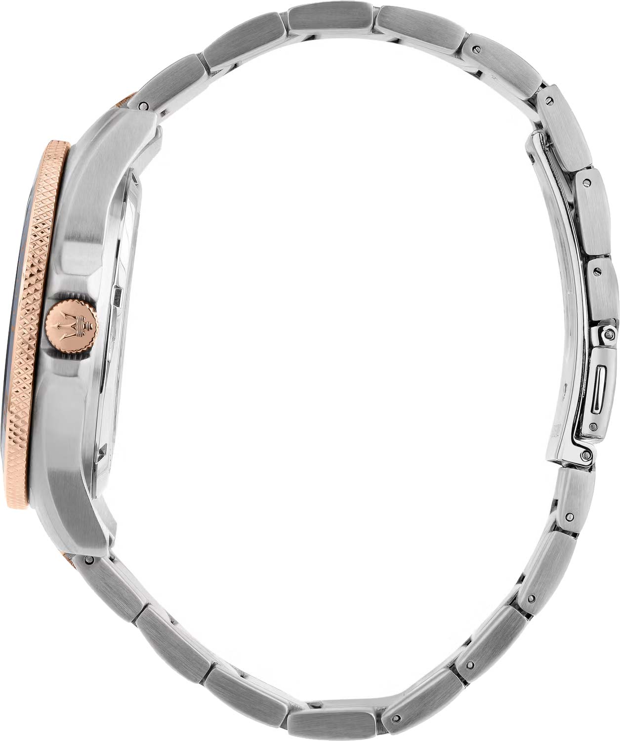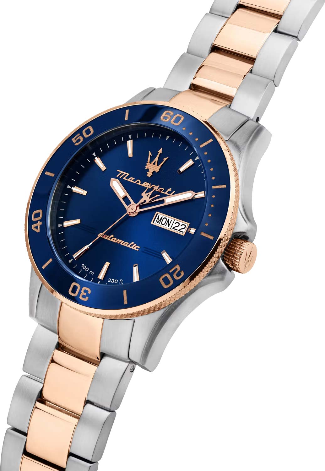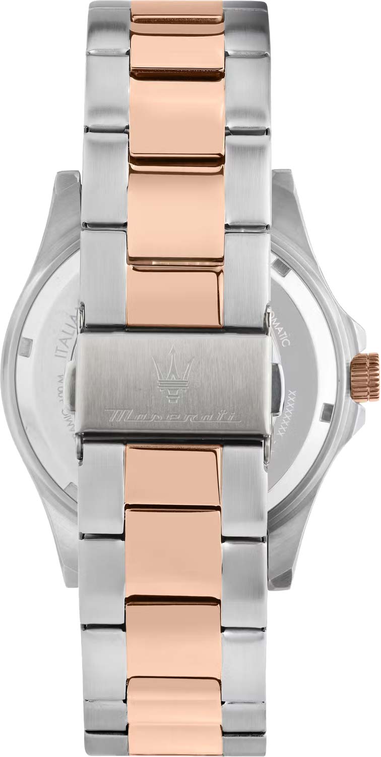Циферблат выполнен по технологии Sunray (солнечные лучи) и украшен фирменным логотипом «Maserati». Метки в виде штрихов. Окошко даты и дня недели находится в положении 3 часа.