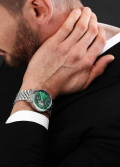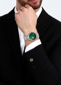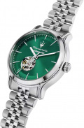 Метки в виде штрихов. Сквозь прозрачное окошко на циферблате можно наблюдать за работой механизма часов. Рифленая заводная головка.
