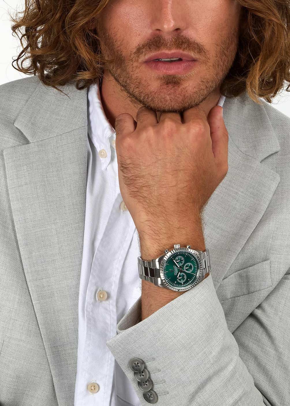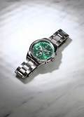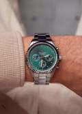 Время в 24-х часовом формате, дата и день недели вынесены на отдельные циферблаты. Рифленая заводная головка. Завинчивающаяся задняя крышка. Браслет с раскладывающейся застежкой.