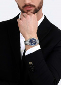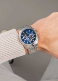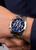 Окошко даты находится в положении между отметками 4 и 5 часов. Рифленая заводная головка. Браслет с раскладывающейся застежкой.